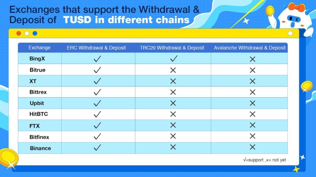TUSD has kept up with the latest trend to increase transparency and stability of different public chains and DeFi ecosystems so digital assets can flow freely worldwide. In addition to TRON, it has been natively deployed on Ethereum, BNB Chain, and Avalanche. Its monthly trading volume on over 100 exchanges, including Binance, Huobi, and OKX, has reached the billions, proving its immense liquidity. The tables below show some popular exchanges that support TUSD.