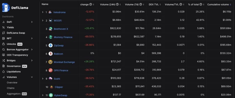 The team has long been committed to capital efficiency, focusing on refining its proprietary algorithm to support high trading volumes with minimal Total Value Locked (TVL), to deliver sustainable and long-term yields for its users. This dedication has propelled the platform to some notable achievements. Wombat Exchange has swiftly secured a position among the top 7 on DefiLlama in terms of accumulated trading volume, surpassing even industry giants like SushiSwap, on Optimism, without any trading incentives, within just two months after its launch.