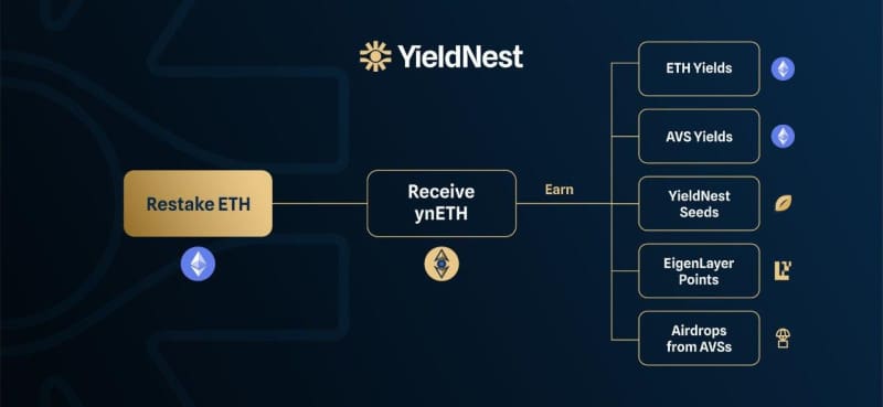 Restaking ETH on YieldNest is simple, where users receive ynETH (a native liquid restaking token) to earn base layer and restaking rewards. YieldNest provides an easy solution for ETH holders to natively restake their ETH into EigenLayer and potentially earn rewards without sacrificing liquidity.