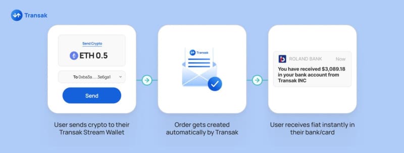 Imagine this: A user with a Web3 wallet wants to withdraw $1,000 USDC. All they need to do is send their crypto to their unique Transak Stream Address. Within seconds, the equivalent fiat amount is deposited into their bank account or card— no order placement, no need to open additional apps, no widget.